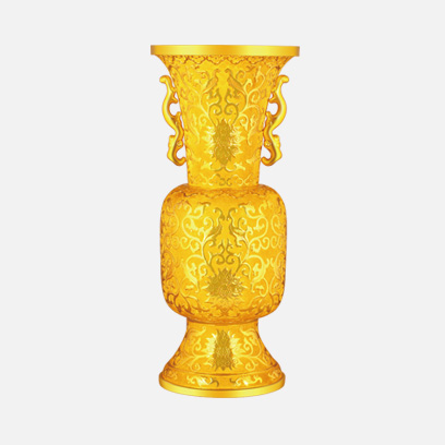 金纏枝花卉紋雙耳尊,以清中期掐絲琺瑯產(chǎn)值花卉雙耳尊為原型,侈口,筒腹,圈足,通體鏨刻纏枝花卉紋,兩側(cè)飾夔龍耳。由于此尊原型為清代宮廷陳設(shè)用器,造型又來(lái)源于商周青銅器,因此每一個(gè)細(xì)節(jié)都凸顯出皇家獨(dú)有的華貴氣質(zhì),美不勝收。